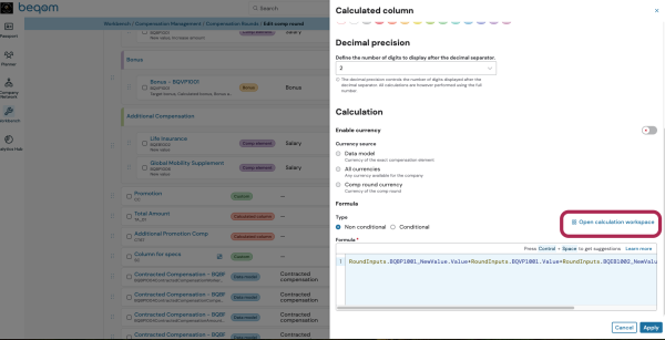 With version 21.1 of Pay Suite, we have redesigned the workspace for advanced calculations. A new wider, dedicated environment now facilitates creating and editing calculated columns within compensation rounds. Replacing the previous drawer-based interface, the full-width Calculation workspace provides significantly more space for formula building, for a more pleasant use experience and added efficiency.