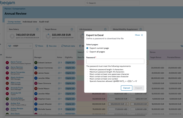 To protect sensitive compensation information, a password is required for the export. This ensures that data remains secure even when accessed outside the platform.