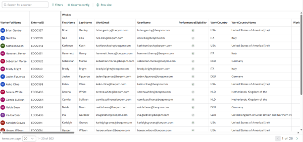 Users can now view a grid that displays all workers they are authorized to see. The grid presents information in a business-friendly format that eliminates the need to navigate schema-level entities. It is modeled around the Worker as the primary object and surfaces relevant contextual information such as employment and organizational attributes.