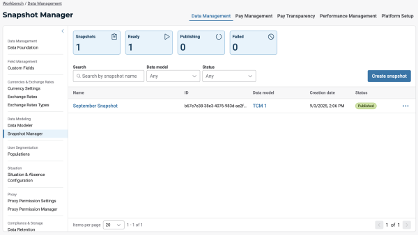 The Global Compensation Admin, Pay Analytics Admin, Data Modeler Admin, and Configuration roles retain full Snapshot Manager access, including the ability to view, create, and export snapshots.
