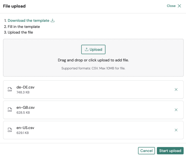 Download & edit CSV templates: for each selected language, a CSV file containing all customizable labels can be downloaded. Each file contains three columns: