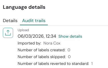 Audit trail & observability: clicking any of the languages in the language list opens a drawer containing information such as the last update date, the user who made the last update, and the translation source (standard or custom). In addition, a full audit trail is available per language, including the upload history, the number of labels created or skipped, and the import metadata for observability and compliance.
