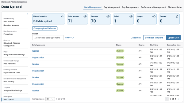 We have introduced a flexible Data Retention feature for CPM customers, allowing users with compensation admin professional role to configure customized retention settings to meet their organization’s data management needs. This enhancement supports compliance and data management practices tailored to diverse regulatory environments. This feature is located under Workbench > Data Management section and it enables: