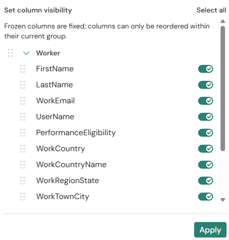 Moreover, the worker grid supports configurable columns, allowing users to tailor the view to their needs. All available attributes are organized by domain, for instance Worker, Employment, or Demographics, and can be individually toggled on or off. For example, within the Worker group, users can choose to display or hide attributes such as FirstName, LastName, or WorkEmail. Additionally, it is possible to reorder columns within their respective groups to personalize the grid layout.