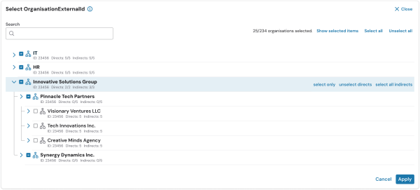 Instead of manually typing External IDs, users can now select values from an intuitive visual pop-up that displays both the ID and name of each entity, making selection more user-friendly and accurate. The new interface offers full hierarchy awareness, allowing users to select parent entities and automatically include all sub-entities, with expandable/collapsible hierarchical structures for easier navigation. Population previews were also enhanced to explicitly show which entities and sub-entities are included, providing greater transparency and reducing configuration errors.