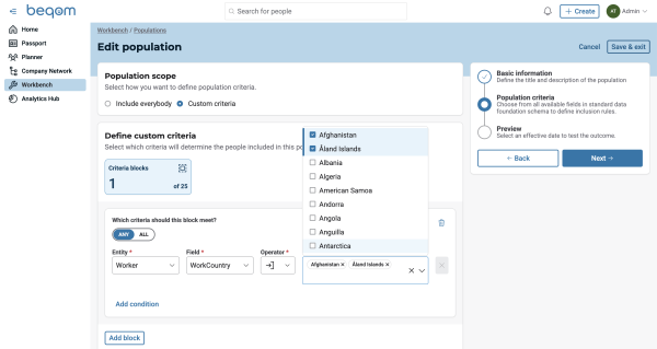 Custom populations can be created with unique names and descriptions, ensuring easy identification and organization. Populations are defined using multiple criteria, allowing precise filtering of data. Each criterion is built by selecting a field from an entity, choosing an operator (such as Equal To, Not Equal To, or Contains), and providing a value. For example, a population could be defined by selecting the Worker Entity, the WorkCountry field, the Equal To operator, and the value "Ireland".