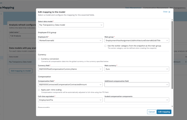 To create a dataset from the Snapshot Manager, users first need to locate Pay Analysis Data Mapping in Workbench > Data Management. There, they can define the mapping that establishes how the dataset creation in PayAnalytics should be parametrized, ensuring all mandatory fields are accounted for. Once configured, users can select a snapshot and trigger the dataset creation from the action menu on the Snapshot Manager page.