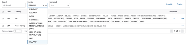 Country filter: filters the list to display currencies used in a specific country by selecting from the "Country" dropdown menu.