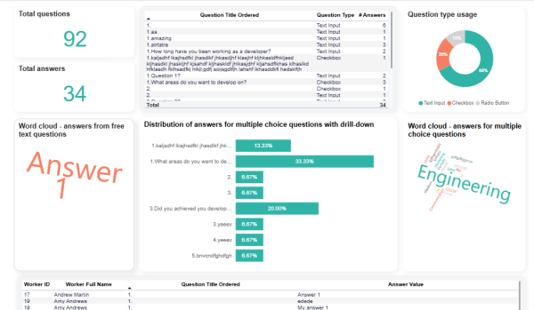 A detailed answer-level table at the bottom, showing individual responses by user and question