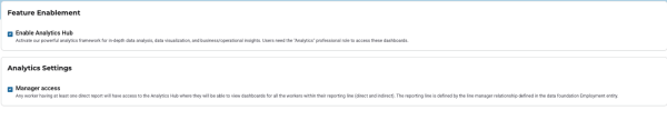 The manager access to the Analytics Hub is now dependent on the activation state of the hub, i.e. when Analytics Hub is disabled, the Analytics for managers setting is also unavailable.
