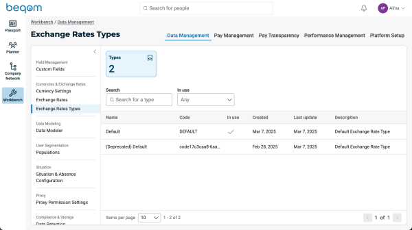 Accessible under Workbench > Data Management > Exchange Rate Types, this new user interface enables users with the Data foundation admin or the Global compensation admin role to create and manage exchange rate types that can be later used together with exchange rates.