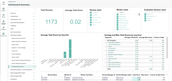 With version 21.0, we are introducing an addition to the Analytics Hub. Following the recently released Performance Management functionality for calculating total goal achievement scores, users can now explore the data behind it in the Analytics Hub Review report, where we have included a new page called Achievement Summary, under the Performance Review report.