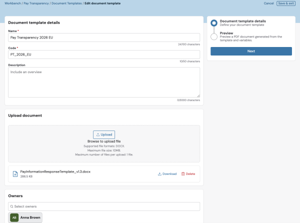 Compensation Admins can change a template's details or owners and update its layout or content by uploading new .docx files.