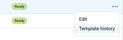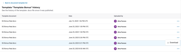 Each upload generates a new stored version of the file. You can access these historical versions through the Template history button on each published document template, as presented in the following image:
