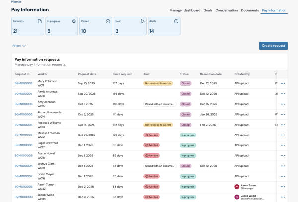 Below the tiles, a filterable and paginated list displays individual pay information requests. The list consists of several columns: Request ID, Worker, Request date, Since request, Alert, Status, Resolution date, Created by, and Comm round, and is sorted by request date, with the older request displayed first.