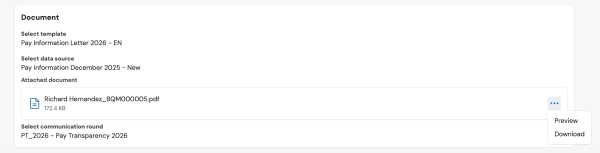 The View request page also includes the Document panel, which may display the template, data source, and communication round selected for a pay transparency letter released to the worker, as well as the final document attached.
