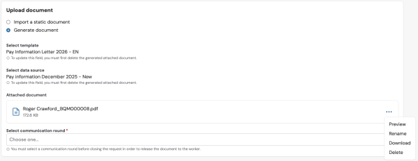 To release any document to the worker, you must select a communication round from the drop-down list before closing the request.