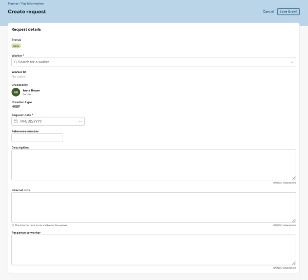 Save the request by clicking the Save & exit button located in the top-right corner of the page. The pay information request is created on behalf of the worker and added to the list existing requests.