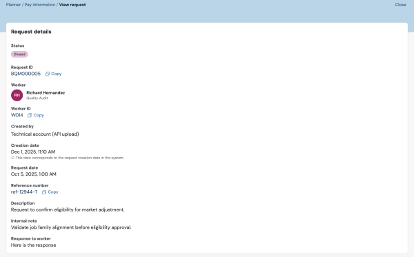 On this page, the Request details panel offers more information about a request, such as its status (New, In progress, or Closed), the request ID, the request date, the creation channel (requests generated by external systems via inbound APIs, worker, in the form of formal pay information requests submitted through the digital reward statement, or HRBP as requests created manually on behalf of workers) or the description of the request.